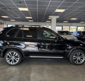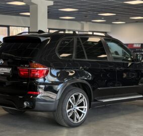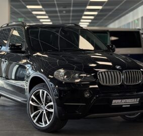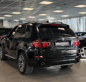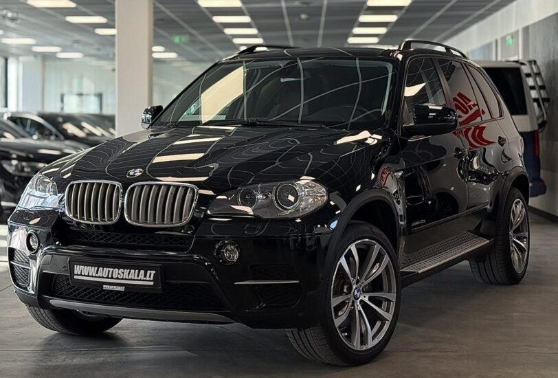 BMW X5 xDrive40d (E70) su galingu ir patikimu 3.0 dyzeliniu varikliu (225 kW). Automobilis pagamintas 2010-06, juodos spalvos su prabangiu rudos („Nevada zimt-braun“) odos salonu.